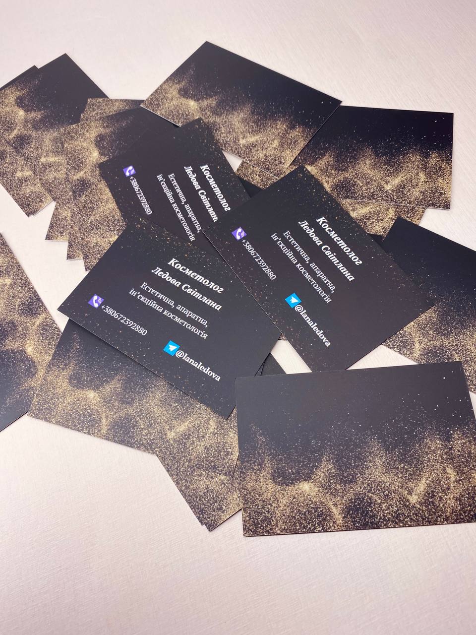 В компании «Полиграфия POLYTECH» можно заказать печать визиток в Киеве односторонние и двусторонние, с размерами 90х50 и 85х55 мм, изготовленные на мелованной бумаге плотностью от 250 до 350 г/м2 методом цифровой, офсетной или шелкотрафаретной печати. Постобработка включает ламинацию глянцевого или матового типа, а также двустороннее покрытие защитным лаком. При необходимости можно воспользоваться услугами дизайнера.